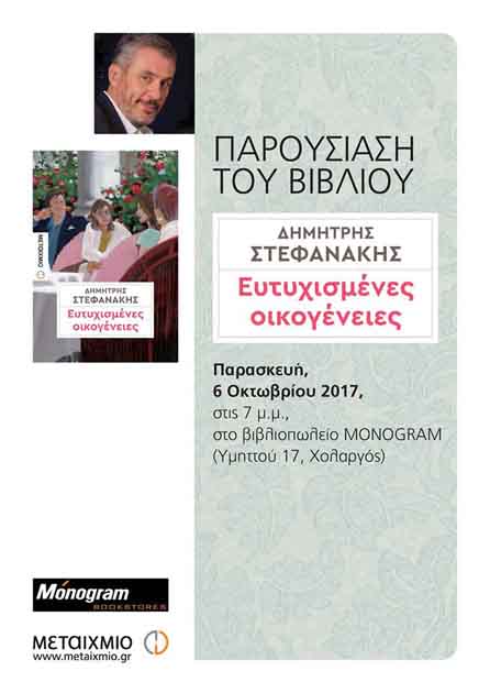Με το βιβλίο του  Δημήτρη  Στεφανάκη « Ευτυχισμένες Οικογένειες» ξεκινούν οι παρουσιάσεις στο βιβλιοπωλείο Monogram.