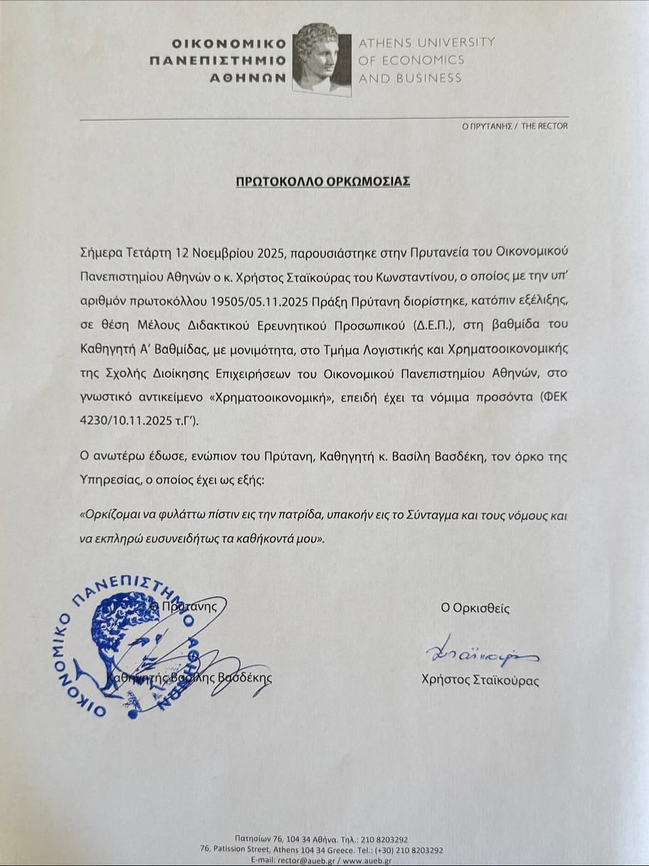 Η σημερινή ορκωμοσία του Χρήστου Σταϊκούρα στη θέση του Καθηγητή στο Οικονομικό Πανεπιστήμιο Αθηνών σηματοδοτεί μια ιδιαίτερα σημαντική στιγμή για τον ίδιο, αλλά και για την ακαδημαϊκή κοινότητα συνολικά. Με πολυετή πορεία στην οικονομική επιστήμη, πλούσια εμπειρία στη δημόσια διοίκηση και ενεργό παρουσία στη χάραξη οικονομικής πολιτικής, ο Χρήστος Σταϊκούρας επιστρέφει στο Πανεπιστήμιο από το οποίο ξεκίνησε, με έναν νέο θεσμικό ρόλο που συνδέει τη γνώση με την πράξη.