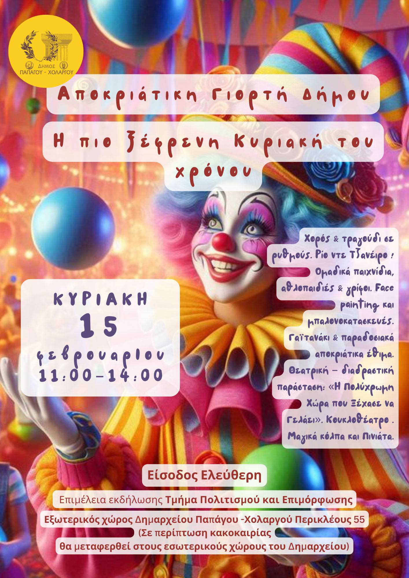 Αποκριάτικο κλίμα, μουσική, χρώματα και δράσεις για όλη την οικογένεια υπόσχεται η φετινή γιορτή που διοργανώνει ο Δήμος Παπάγου–Χολαργού την Κυριακή 15 Φεβρουαρίου, από τις 11:00 έως τις 14:00, στον εξωτερικό χώρο του Δημαρχείου.