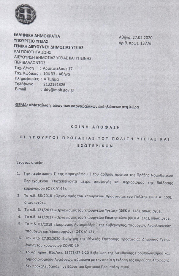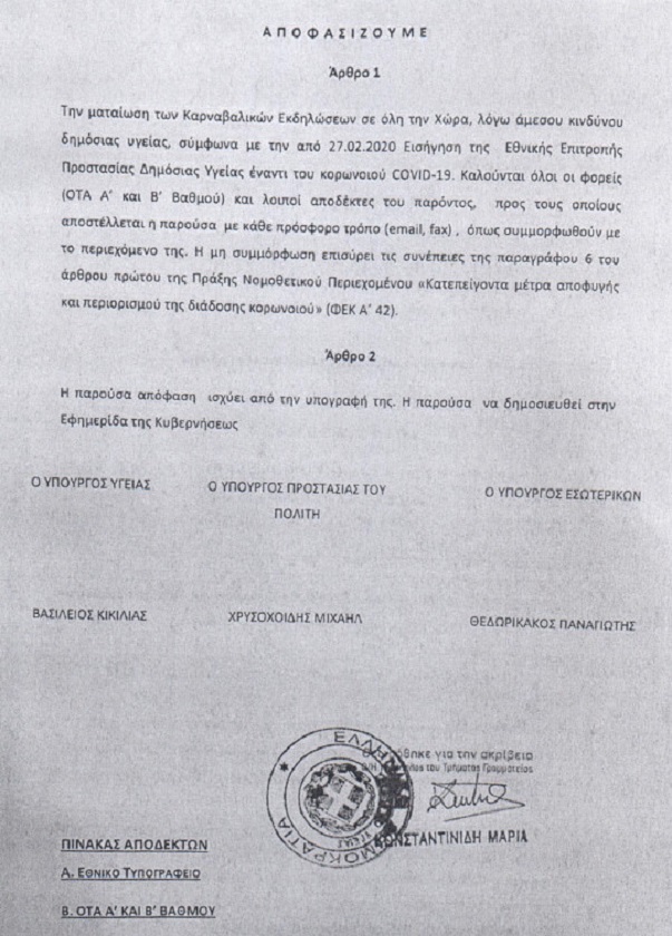 Σύμφωνα με τη χθεσινή κοινή Υπουργική Απόφαση, των Υπουργών Υγείας Βασίλη Κικίλια, Προστασίας του Πολίτη Μιχάλη Χρυσοχοΐδη και Εσωτερικών Παναγιώτη Θεωδορικάκου, «ματαιώνονται σε όλη τη χώρα οι Καρναβαλικές Εκδηλώσεις, λόγω άμεσου κινδύνου της δημόσιας υγείας».