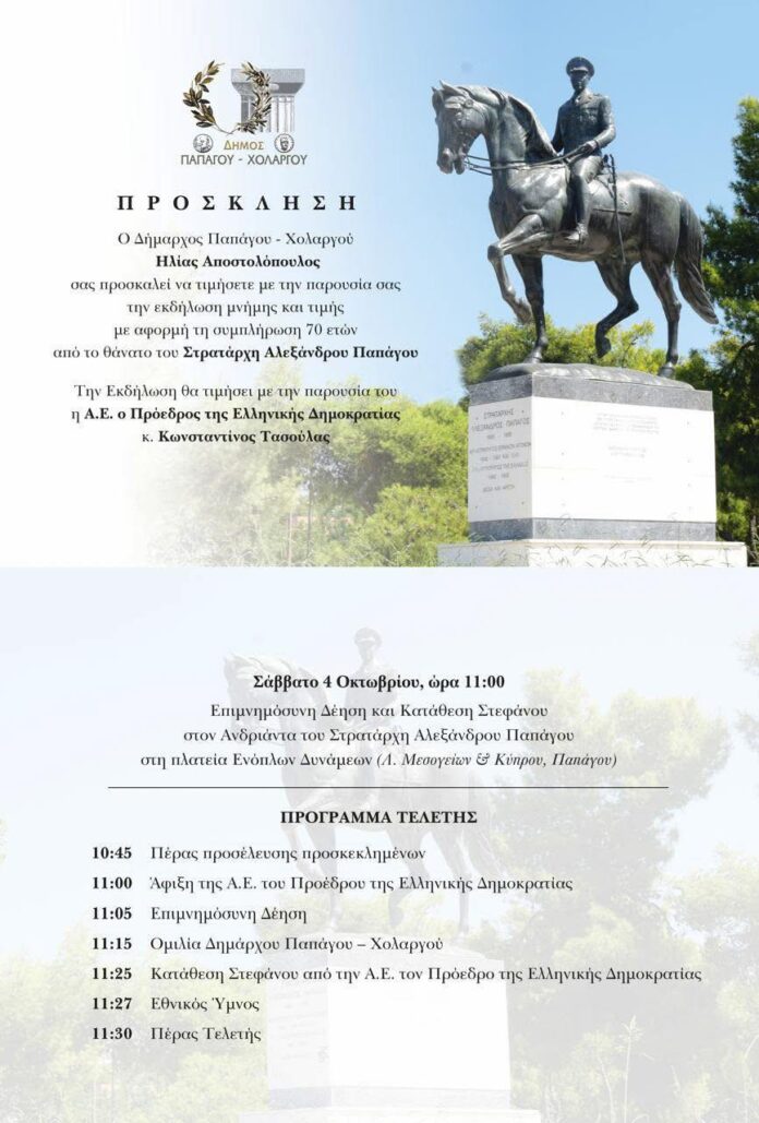 Με αφορμή τη συμπλήρωση 70 ετών από τον θάνατο του Στρατάρχη Αλεξάνδρου Παπάγου, θα πραγματοποιηθεί εκδήλωση μνήμης και τιμής το Σάββατο 4 Οκτωβρίου 2025, στις 11:00 π.μ.