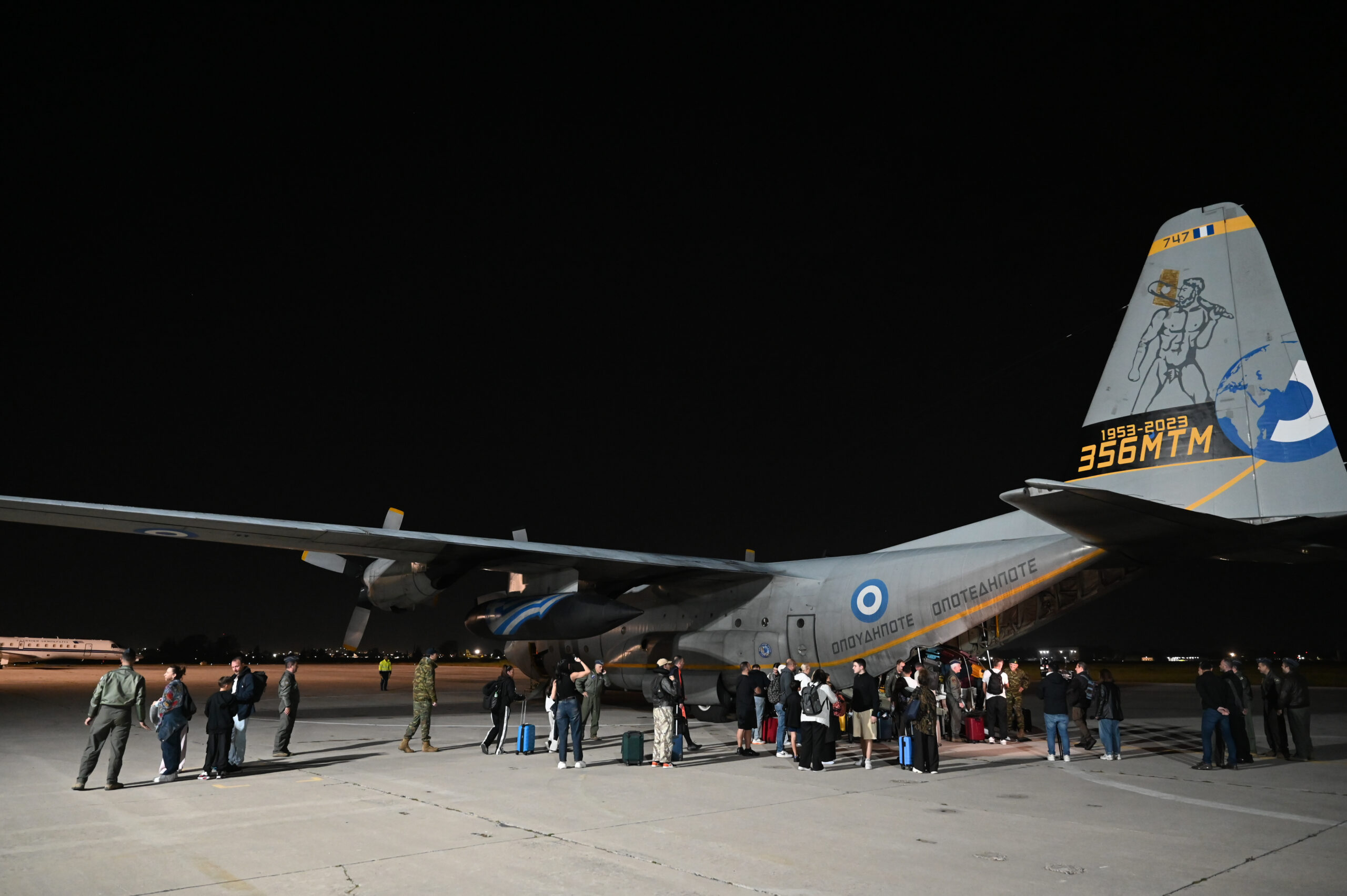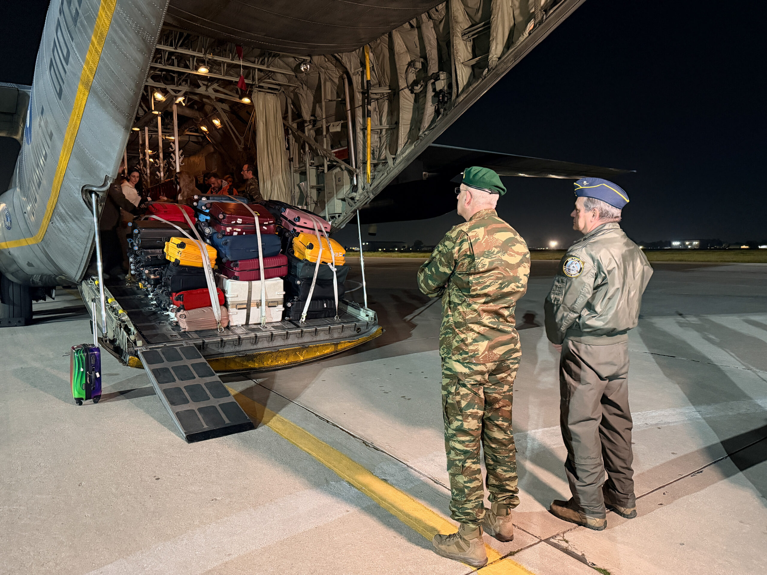 Ελληνικό C‑130 Hercules της Πολεμικής Αεροπορίας προσγειώθηκε στην Ελευσίνα μεταφέροντας 91 Έλληνες πολίτες που είχαν εγκλωβιστεί στο Άμπου Ντάμπι, στα Ηνωμένα Αραβικά Εμιράτα. Η επιχείρηση οργανώθηκε από το Υπουργείο Εξωτερικών και τις ελληνικές αρχές για την ασφαλή επιστροφή των πολιτών λόγω αναστολής των κανονικών πτήσεων στην περιοχή.Οι επαναπατριζόμενοι μεταφέρθηκαν με ασφάλεια στο έδαφος της Ελλάδας και θα συνεχίσουν προς την Αθήνα με λεωφορεία. Η σημερινή πτήση εντάσσεται σε μια σειρά επαναπατρισμών Ελλήνων πολιτών από περιοχές της Μέσης Ανατολής, με τη συνεργασία ελληνικών στρατιωτικών και πολιτικών υπηρεσιών, προκειμένου να διασφαλιστεί η ασφάλεια και η ταχεία επιστροφή τους.