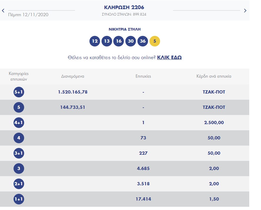 Οι τυχεροί αριθμοί που ανέδειξε η κληρωτίδα είναι οι εξής: 12, 13, 16, 30, 36