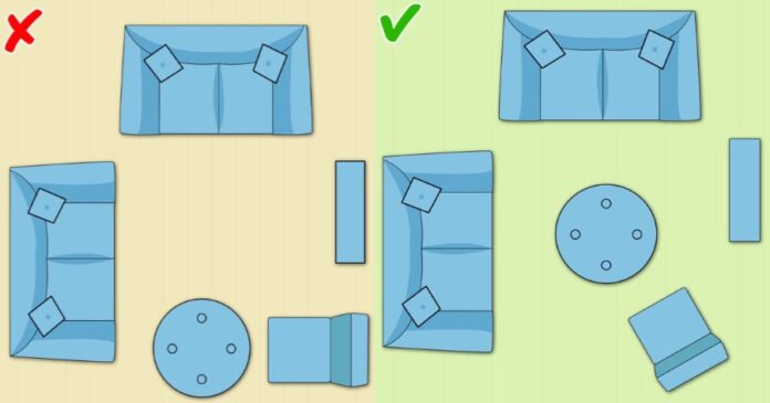 – Η διαγώνια διαρρύθμιση: Βελτιώστε την κίνηση στο σαλόνι σας χρησιμοποιώντας μια διαγώνια διάταξη για τα έπιπλά σας, ειδικά εάν το σαλόνι σας είναι τετράγωνο. Είναι αισθητικά ισορροπημένη, εξοικονομεί χώρο και είναι πολύ εύκολο να διαρρυθμιστεί. Απλά περιστρέψτε τα έπιπλά σας υπό γωνία 45 °.