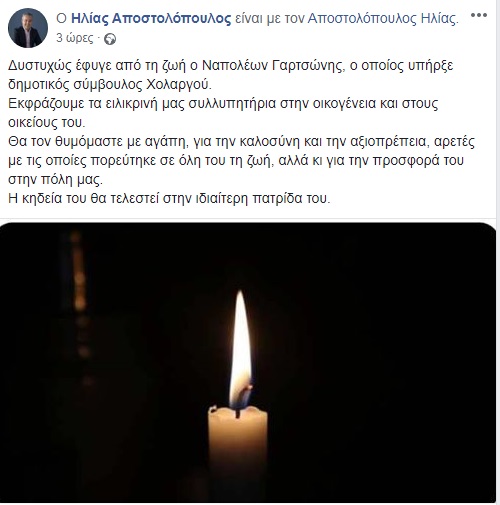 ”Δυστυχώς έφυγε από τη ζωή ο Ναπολέων Γαρτσώνης, ο οποίος υπήρξε δημοτικός σύμβουλος Χολαργού.