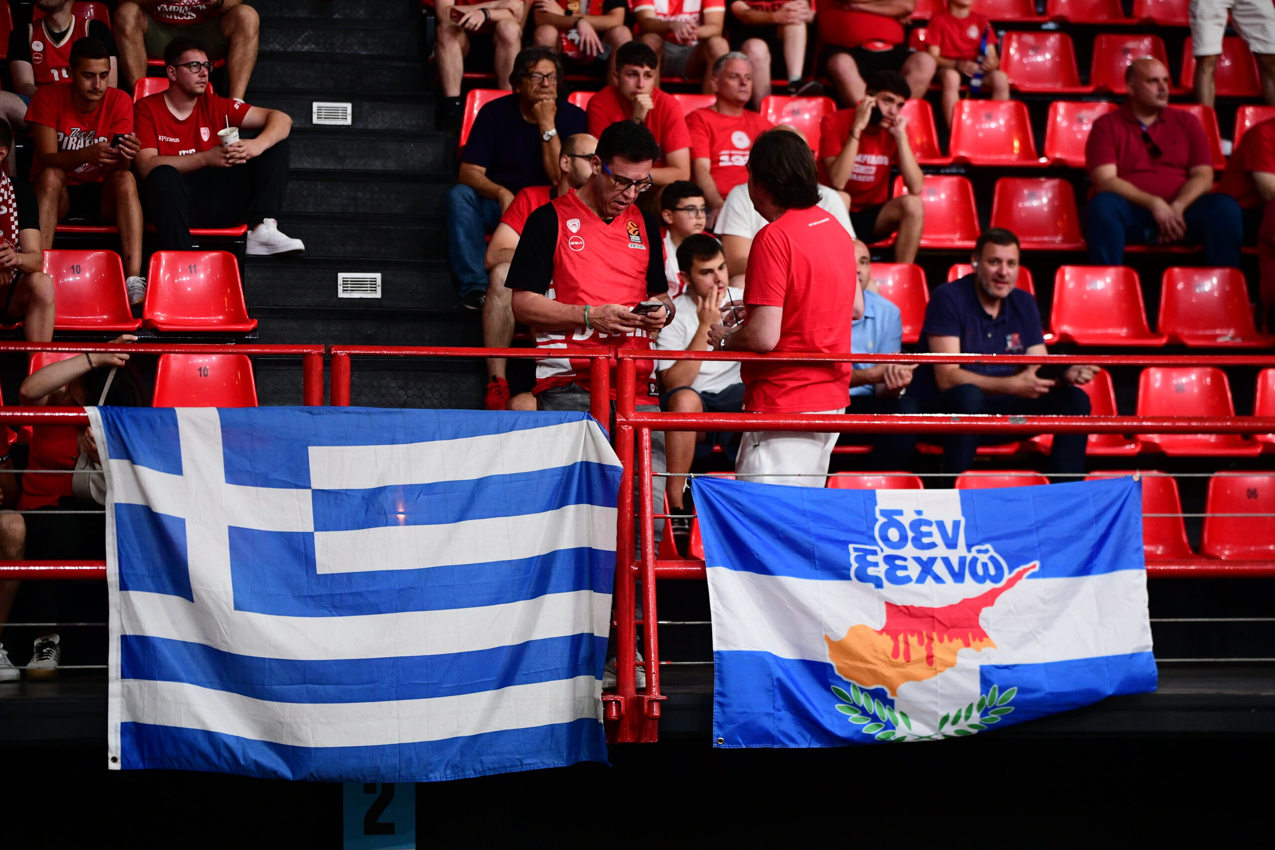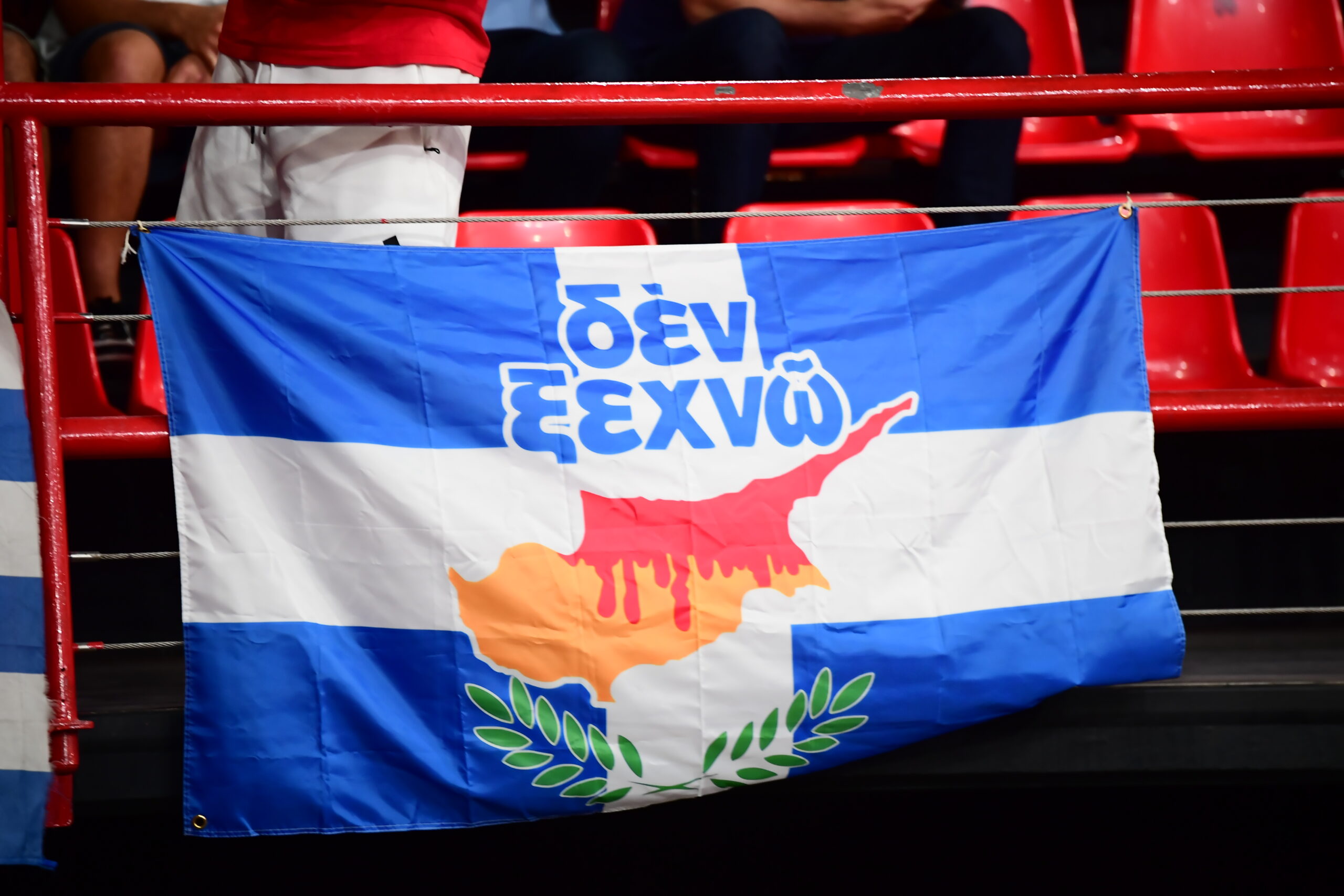 Ιδιαίτερη εντύπωση προκαλούν οι ελληνικές σημαίες που φέρουν πάνω τους το σχήμα της Κύπρου και τη φράση «Δεν ξεχνώ» — ένα ξεκάθαρο πολιτικό και ιστορικό μήνυμα που αναφέρεται στην τουρκική εισβολή στην Κύπρο το 1974. Οι σημαίες αυτές έχουν αναρτηθεί σε κεντρικά σημεία του γηπέδου, ανάμεσά τους και πίσω από τον πάγκο του Παναθηναϊκού, στέλνοντας ένα συμβολικό μήνυμα τόσο εντός όσο και εκτός παρκέ.