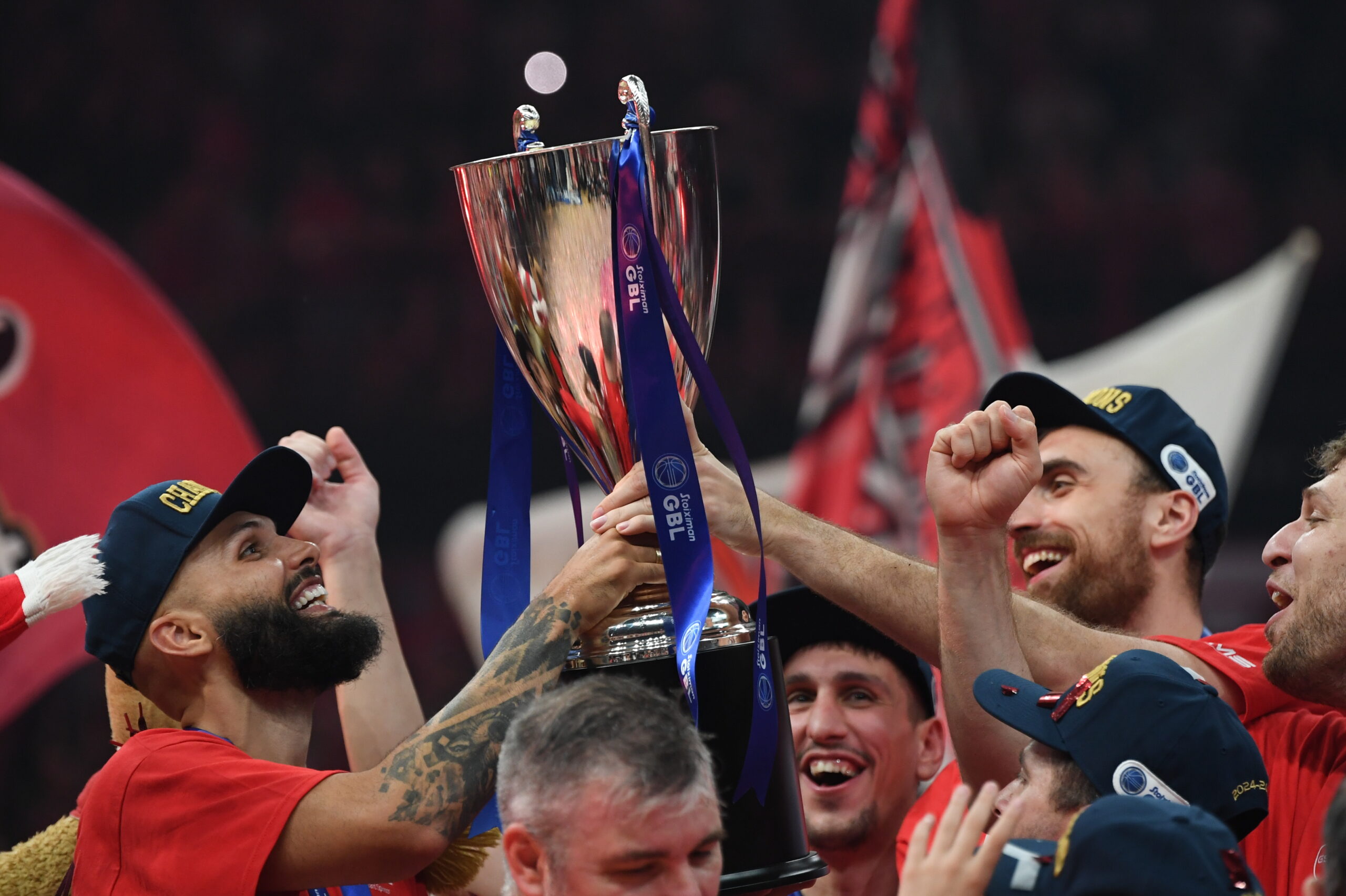 Ο αρχηγός του Ολυμπιακού ύψωσε το τρόπαιο ψηλά στον ουρανό, με τους υπόλοιπους παίκτες να τον αγκαλιάζουν και να ξεσπούν σε πανηγυρισμούς. Καπνογόνα, τραγούδια και συνθήματα πλημμύρισαν τις εξέδρες, ενώ το τρόπαιο πέρασε από χέρια σε χέρια, μέσα σε αποθέωση.