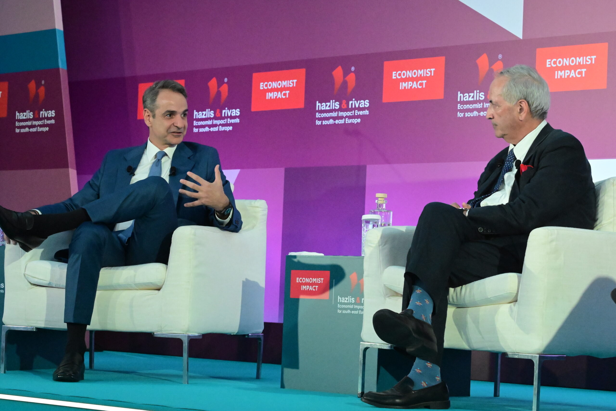 Ο Πρωθυπουργός Κυριάκος Μητσοτάκης συμμετείχε σε συζήτηση με τον Daron Acemoglu, καθηγητή Οικονομικών στο Τεχνολογικό Ινστιτούτο Μασαχουσέτης (MIT), στο πλαίσιο της 29ης Ετήσιας Συζήτησης Στρογγυλής Τραπέζης του «Economist» με την Ελληνική Κυβέρνηση, στο Grand Resort Lagonissi. Τη συζήτηση συντόνισε ο Daniel Franklin, Executive και Senior Editor του «Economist».