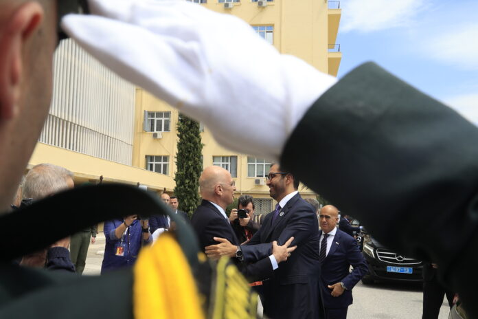 Ο Υπουργός Εθνικής Άμυνας, Νίκος Δένδιας, υποδέχθηκε σήμερα, Παρασκευή 2 Μαΐου 2025, στο Υπουργείο Εθνικής Άμυνας, συνοδευόμενος από τον Υφυπουργό Εθνικής Άμυνας, Θανάση Δαβάκη, τον Υπουργό Βιομηχανίας και Προηγμένης Τεχνολογίας των Ηνωμένων Αραβικών Εμιράτων, Δρ Sultan Bin Ahmed Al Jaber.