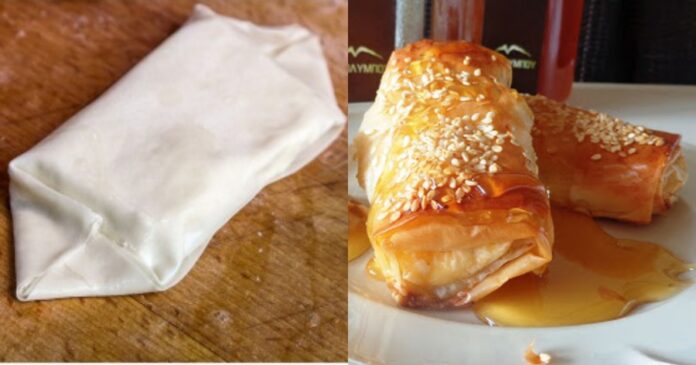 – Παίρνουμε το ένα μισό του φύλλου και βάζουμε στη μία του άκρη ένα κομμάτι από το τυρί φέτα.