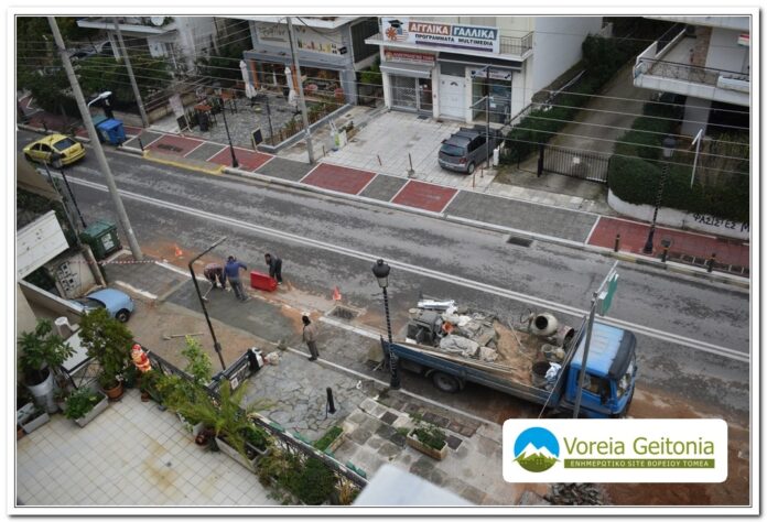 Από νωρίς το πρωί έχουν ξεκινήσει τα έργα αποκατάστασης του πεζοδρομίου.