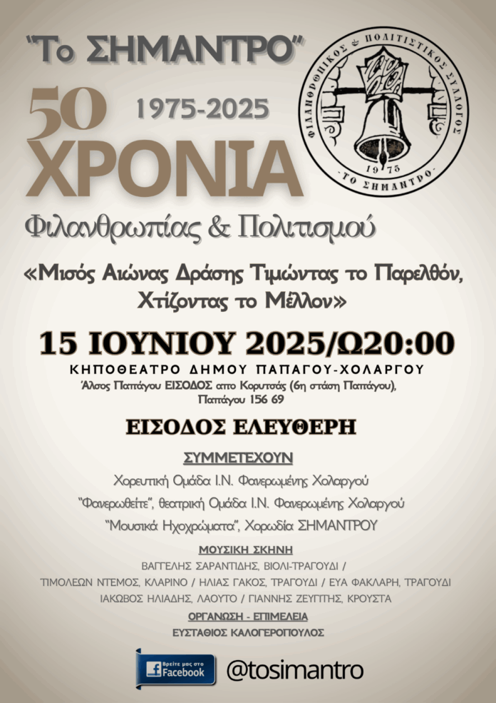 Σήμερα, 7 Ιουνίου 2025, ο Φιλανθρωπικός και Πολιτιστικός Σύλλογος “Το Σήμαντρο” συμπληρώνει 50 χρόνια αδιάλειπτης παρουσίας και δράσης, με πίστη στις αξίες του εθελοντισμού, της προσφοράς, της καλλιέργειας και της σύνδεσης των ανθρώπων.
