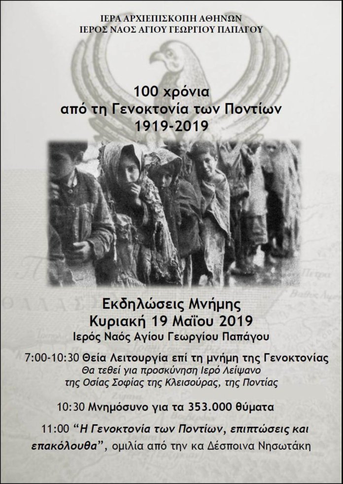 Την Κυριακή 19 Μαΐου ο Ιερός μας Ναός Αγίου Γεωργίου Παπάγου διοργανώνει εκδηλώσεις μνήμης για τα 100 χρόνια από τη Γενοκτονία των Ποντίων.