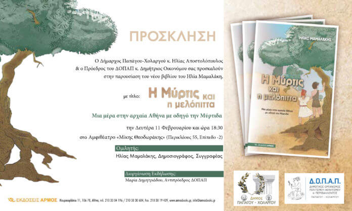 Ο Δήμαρχος Παπάγου-Χολαργού, κύριος Ηλίας Αποστολόπουλος και ο Πρόεδρος του ΔΟΠΑΠ, κύριος Δημήτριος Οικονόμου σας προσκαλούν στην παρουσίαση του βιβλίου «Η Μύρτις και η Μελόπιτα» του κυρίου Ηλία Μαμαλάκη.